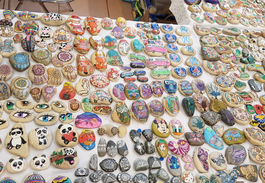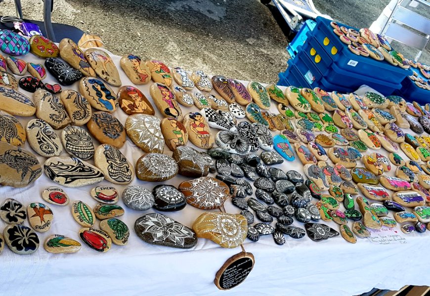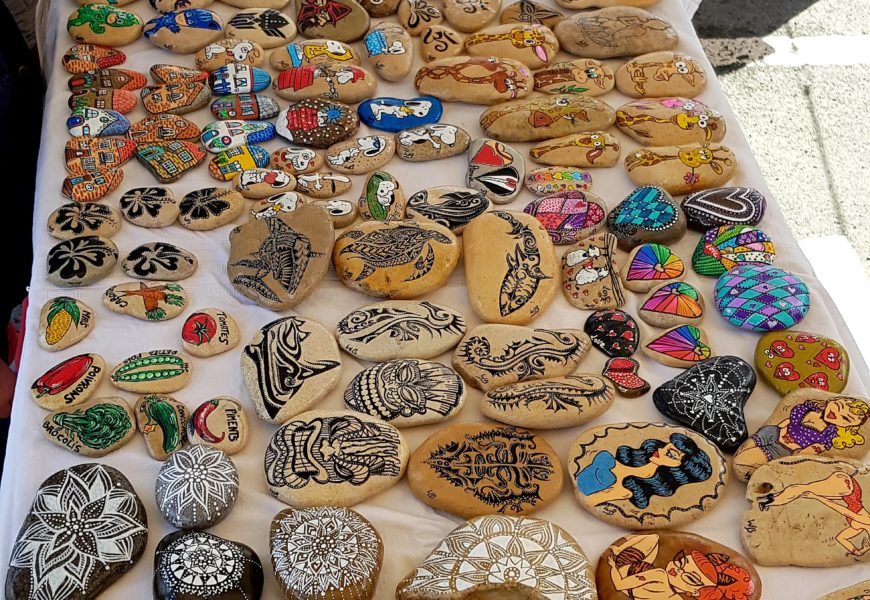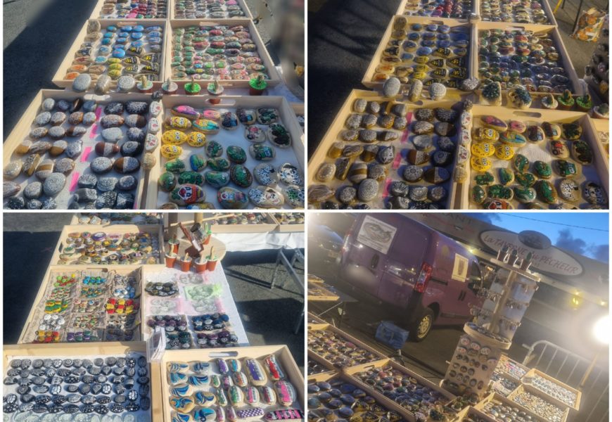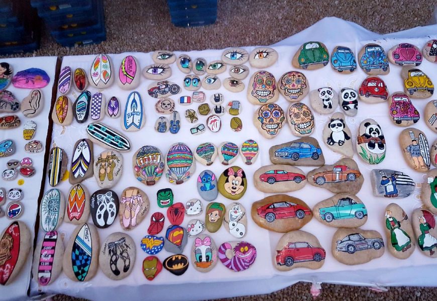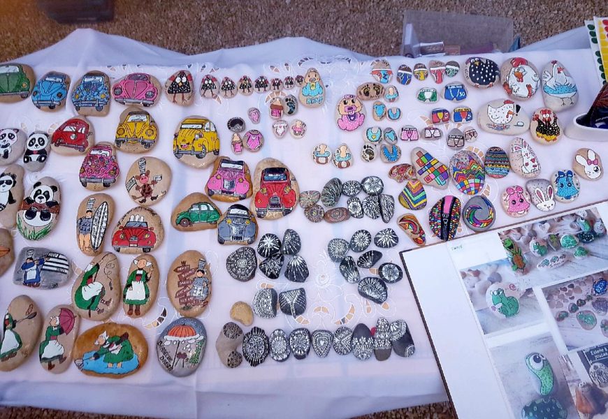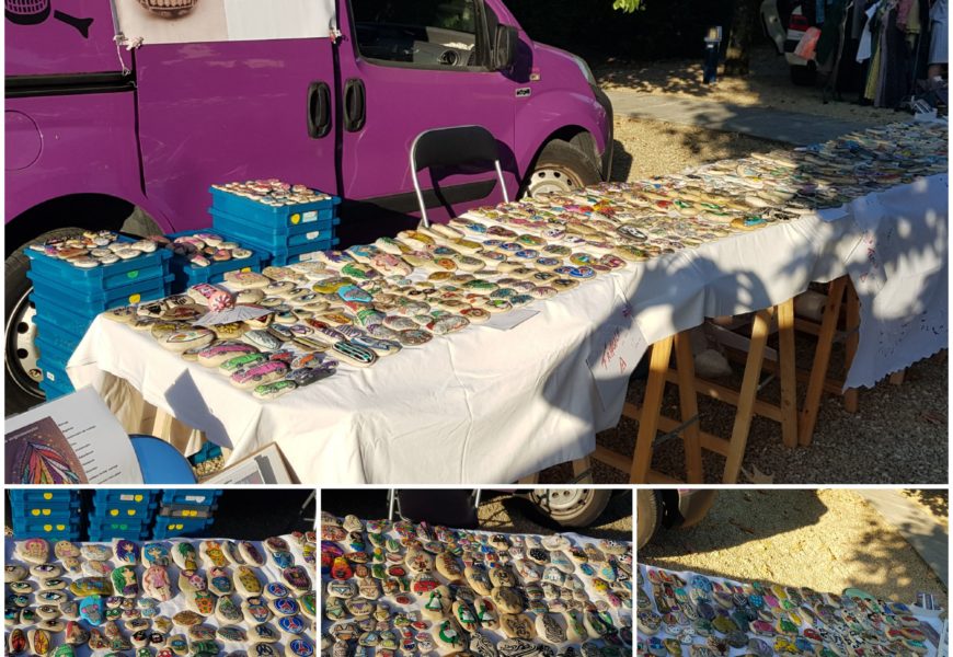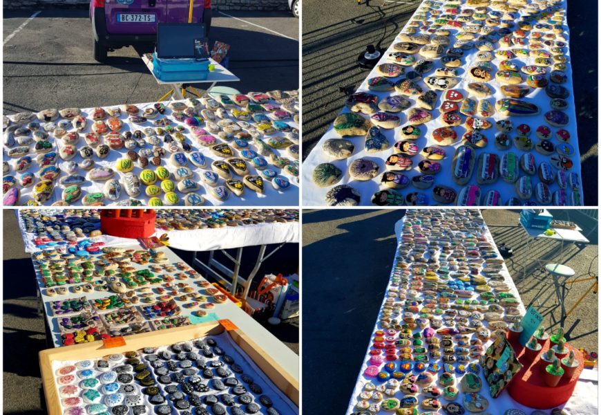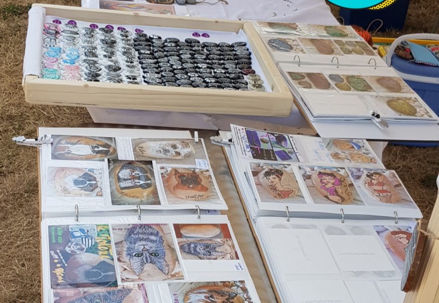de temps en temps j’aime faire voyager tout ces galets auprès de personnes qui ne connaissent pas l ‘ampleur des dessins que l’on puisse faire sur une pierre. raconter l ‘histoire d’un ou 2 dessins et pourquoi pas, être à la rencontre de gens,et dessiner parmi eux.