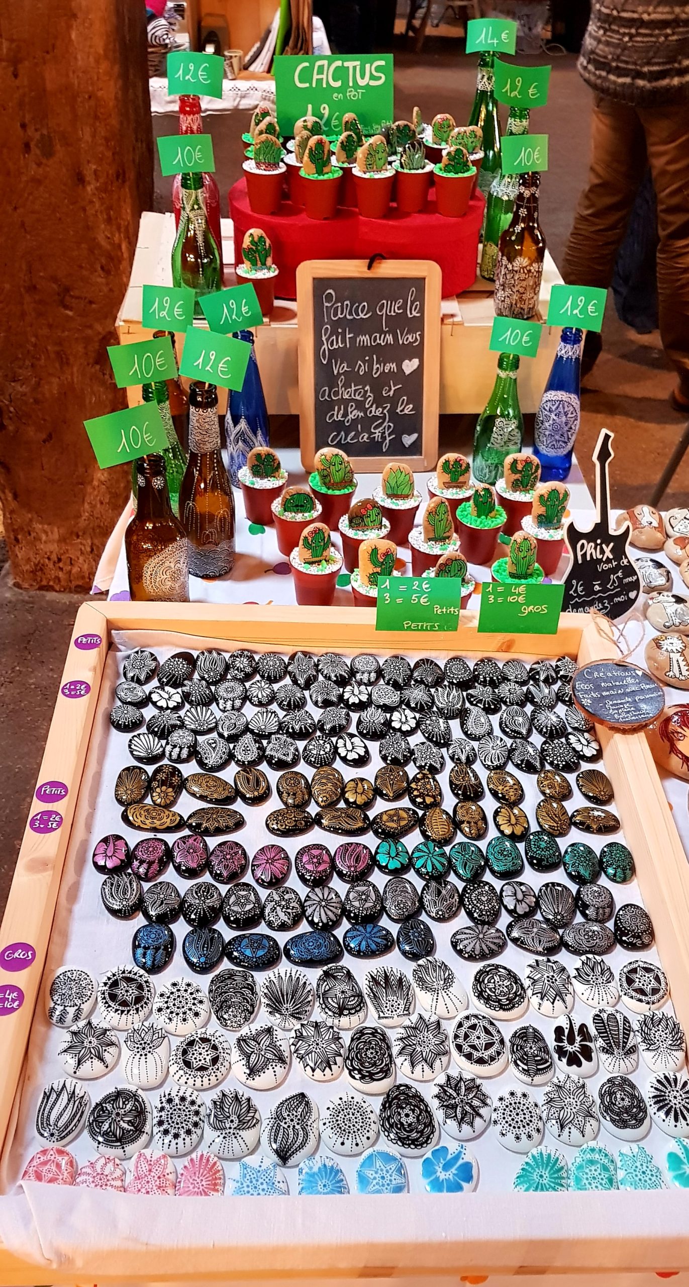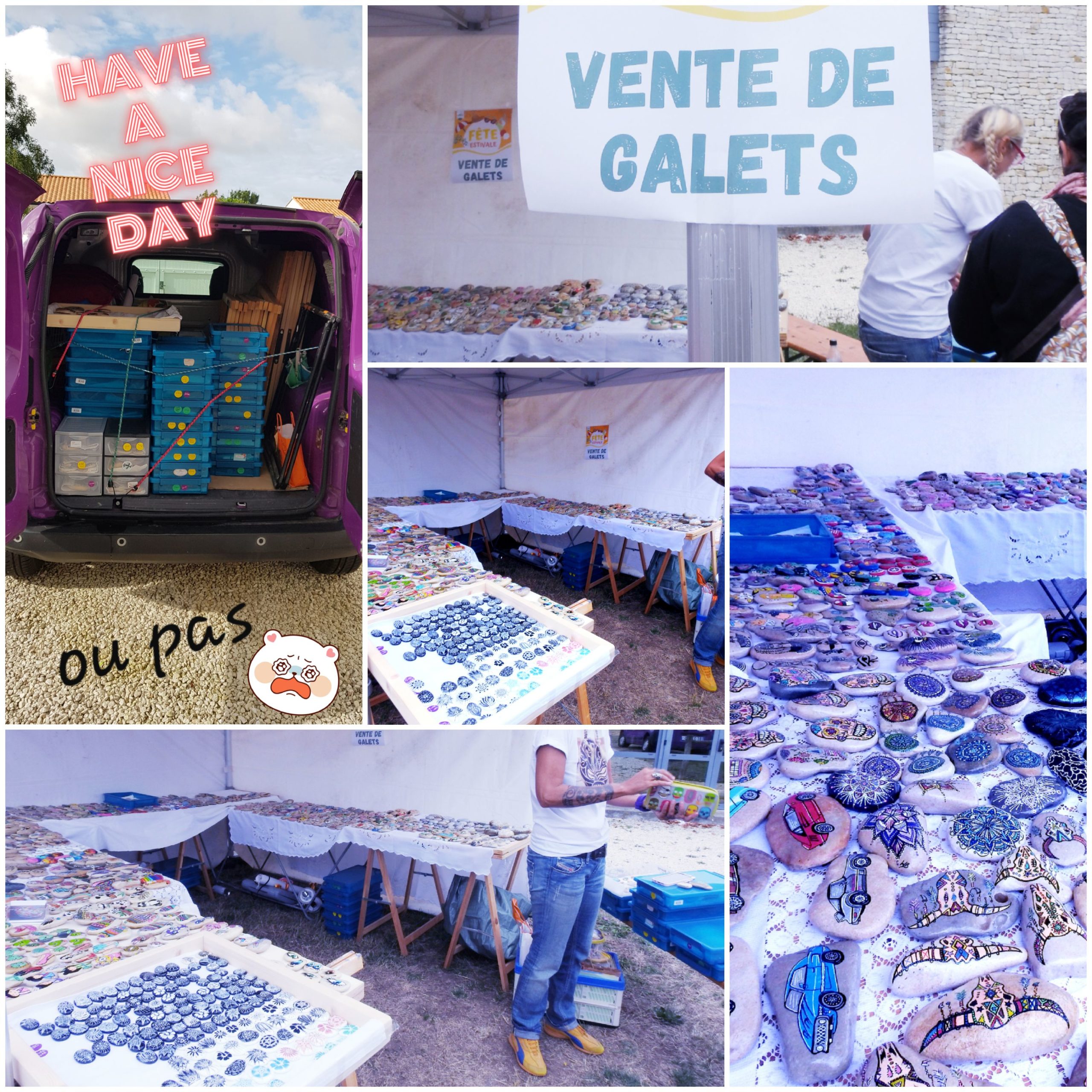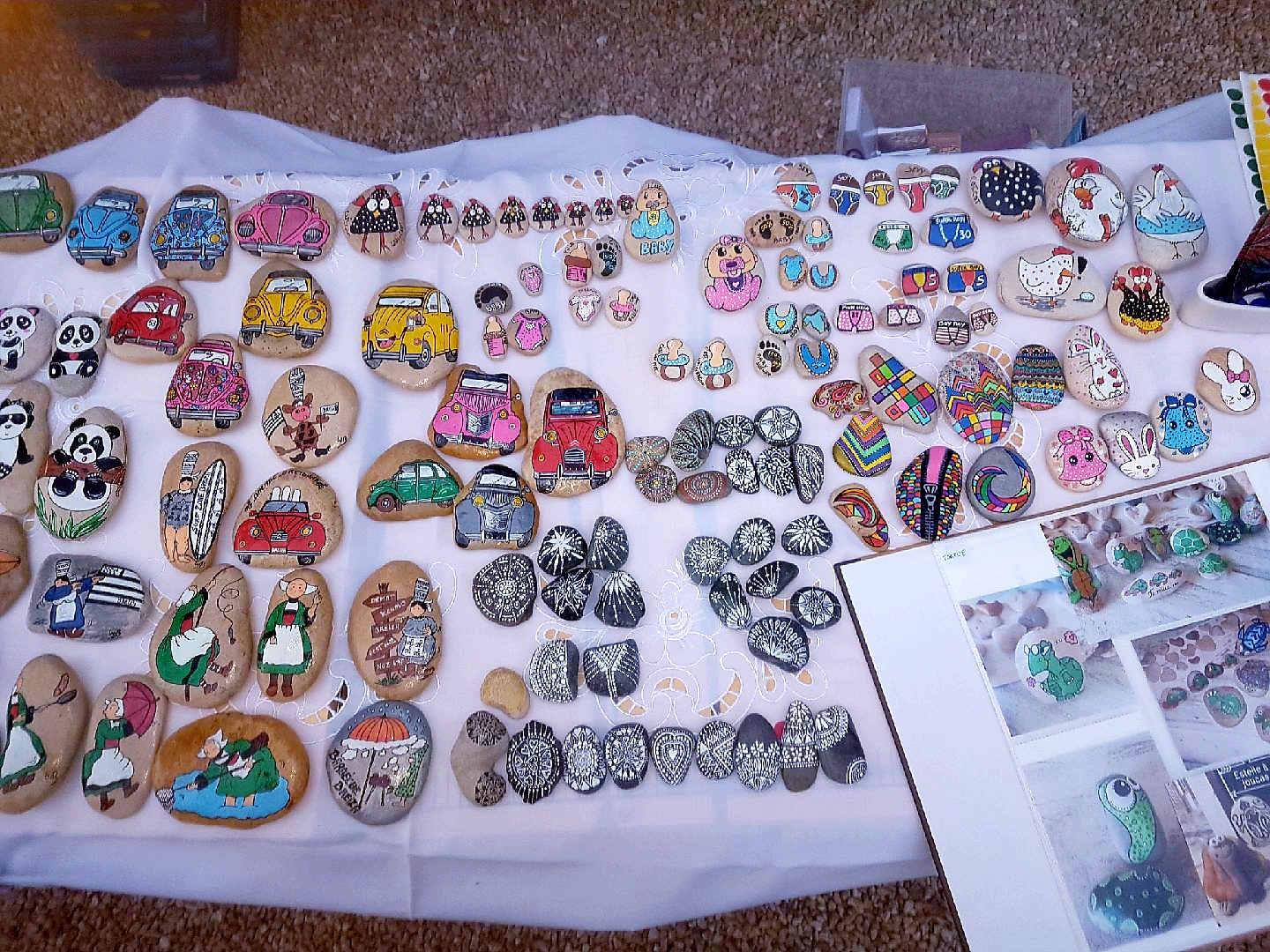 de temps en temps j’aime faire voyager tout ces galets auprès de personnes qui ne connaissent pas l ‘ampleur des dessins que l’on puisse faire sur une pierre. raconter l ‘histoire d’un ou 2 dessins et pourquoi pas, être à la rencontre de gens,et dessiner parmi eux.